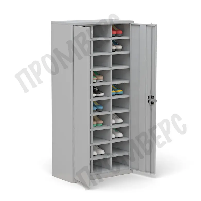 Шкаф открытый. Используется для хранения обуви. Имеет 30 ячеек для хранения. Используется в основном на производствах, гостинницах, и т.д. Конструкция: сварная. Цвет серый. 30 ячеек.
