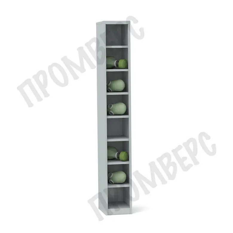 Металлический шкаф расчитанный на 8 противогазов. Конструкция сварная. Шкаф предназначен хранения гражданских, промышленных и изолирующих противогазов. Имеет 8 ячеек. Шкаф открытый. Без дверей. Гарантия 12 мес.
